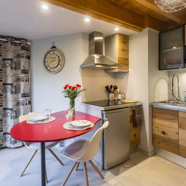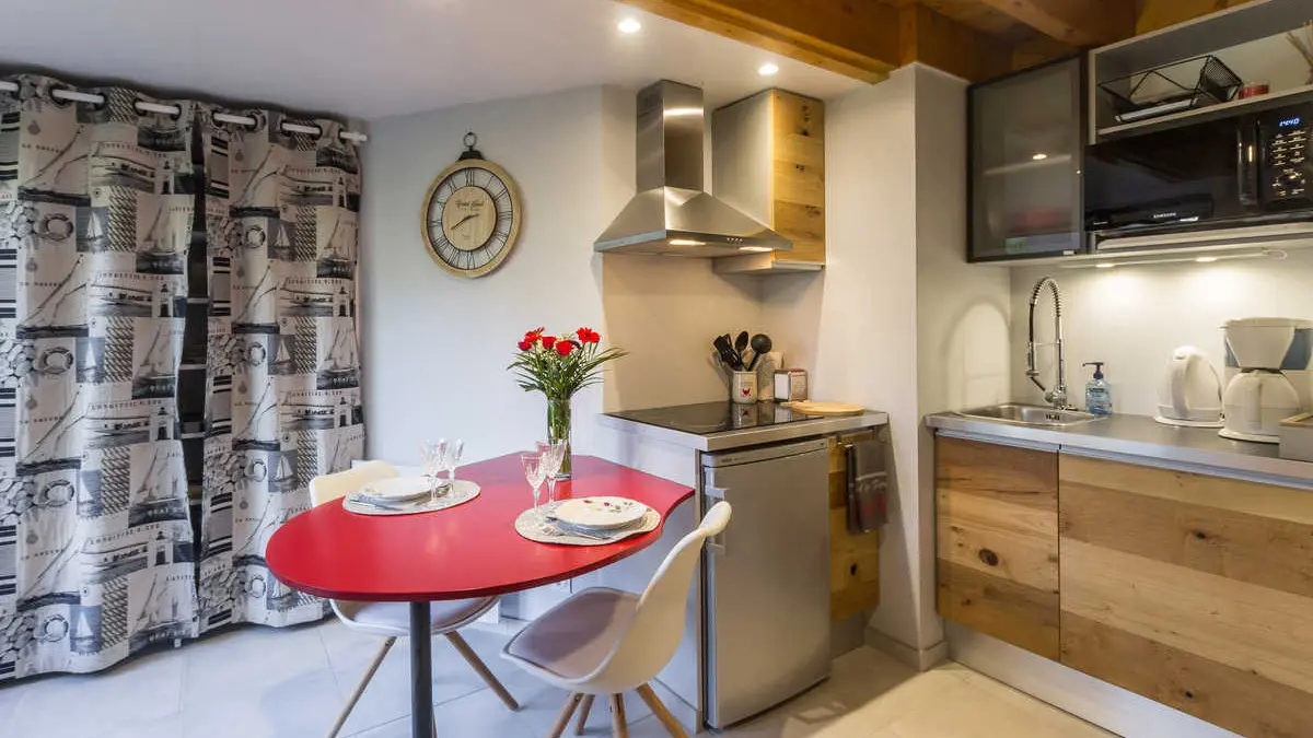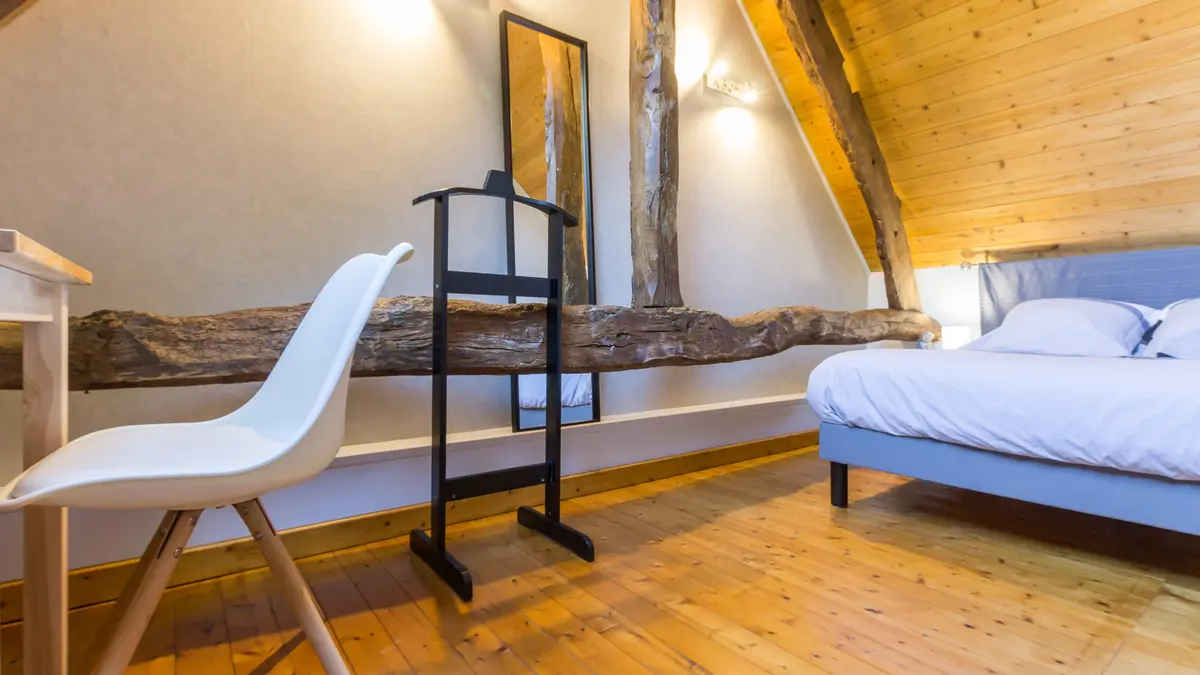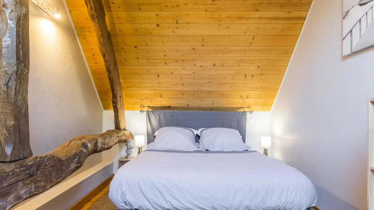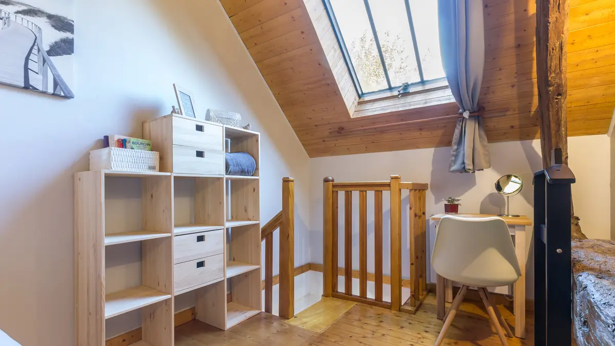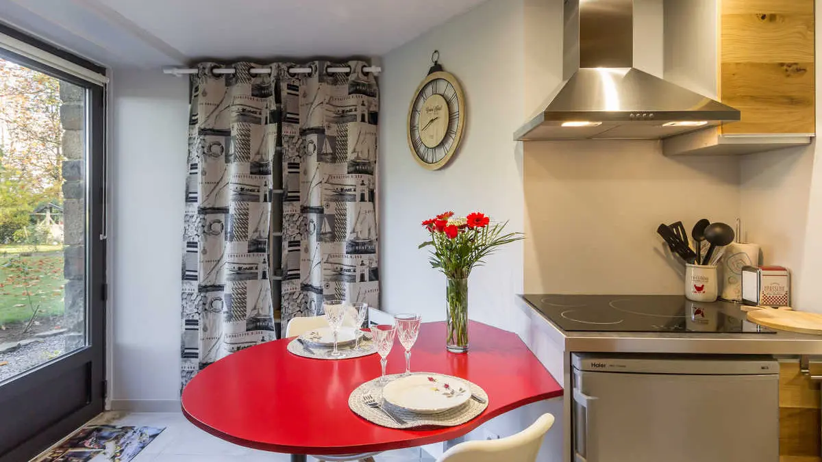 Gîte mitoyen à un autre gîte de 5 personnes. Séjour (TV, Internet Wifi, poste radio/CD). Coin cuisine (plaque induction, machine expresso, cafetière à filtre classique, micro-ondes combiné grill, case congélation, lave-vaisselle). Salle d'eau (douche). WC. A l'étage : chambre en mezzanine (1 lit de 140). Jardin privé non clos. Terrasse. Salon de jardin. Barbecue. Cellier (lave-linge et sèche-linge). Parking dédié aux clients pouvant accueillir plusieurs véhicules. Jardin commun et clos avec aire de jeux (portique, buts foot, bac à sable). Chauffage électrique. Toutes charges comprises. Draps, linge de toilette et linge de maison fournis. Lit fait à l'arrivée. Service ménage compris. Équipement bébé sur demande. Séjour tout inclus. Gîte adapté au télétravail (espace dédié avec bureau, chaise, lampe, connexion internet 4G (Free), prises électriques à proximité). Tous les opérateurs captent dans le gîte.